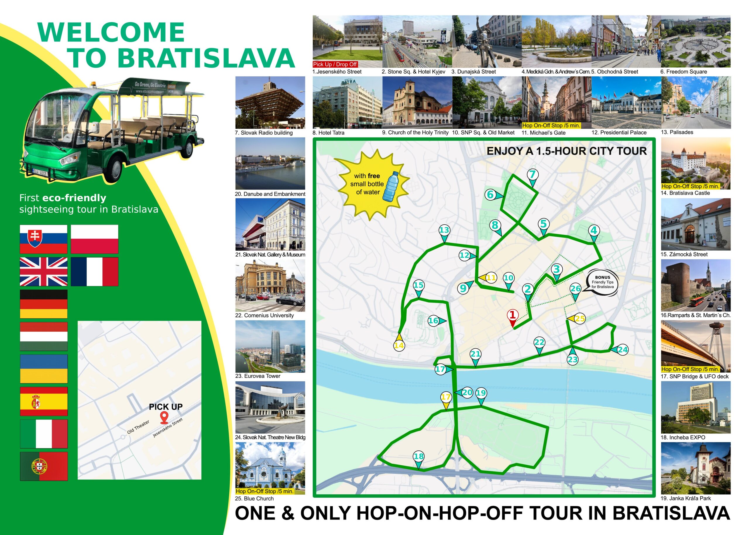 We start our day at 10 am from Jesenského 4 / 811 02, Bratislava and we finish the day at 5:30 pm, returning to the same spot in order to complete the last tour of the day. The last tour of the day starts at 4pm, so we kindly ask you to plan your day accordingly in order to hop on one of the last buses of the day.